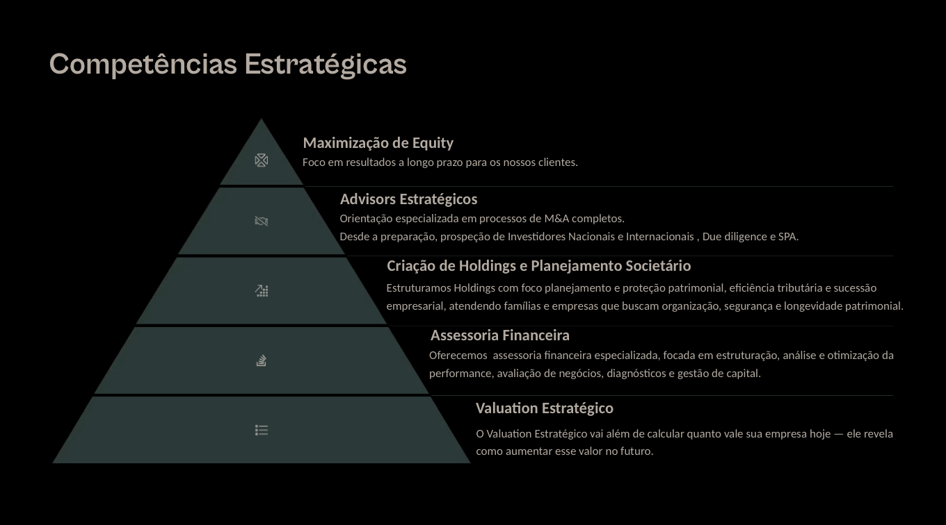 Preparamos sua empresa para atrair investidores qualificados, ajustando estrutura societária, governança, indicadores financeiros e posicionamento estratégico.A reestruturação torna o negócio mais sólido, transparente e atrativo — aumentando as chances de captação e melhorando as condições da negociação.
